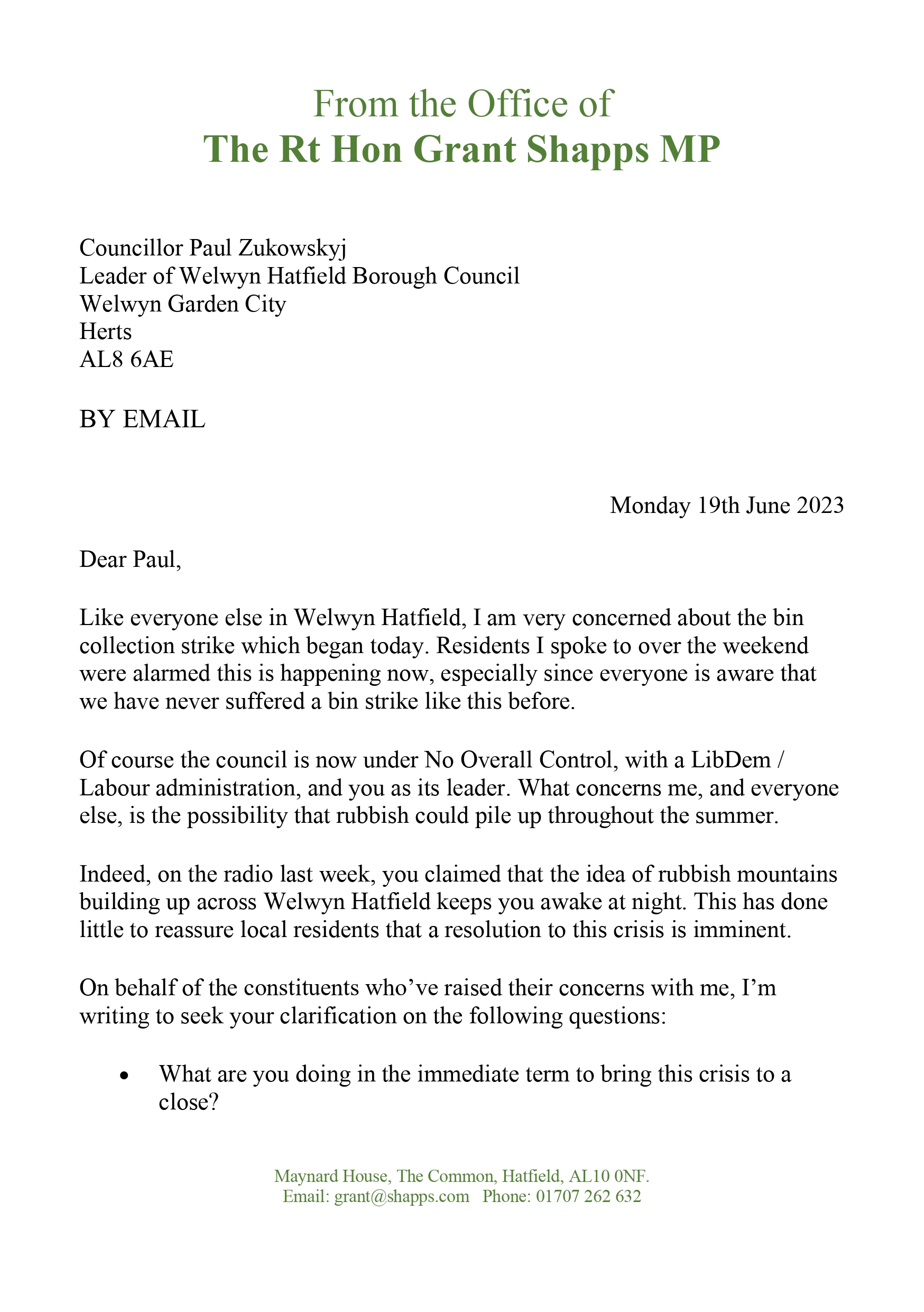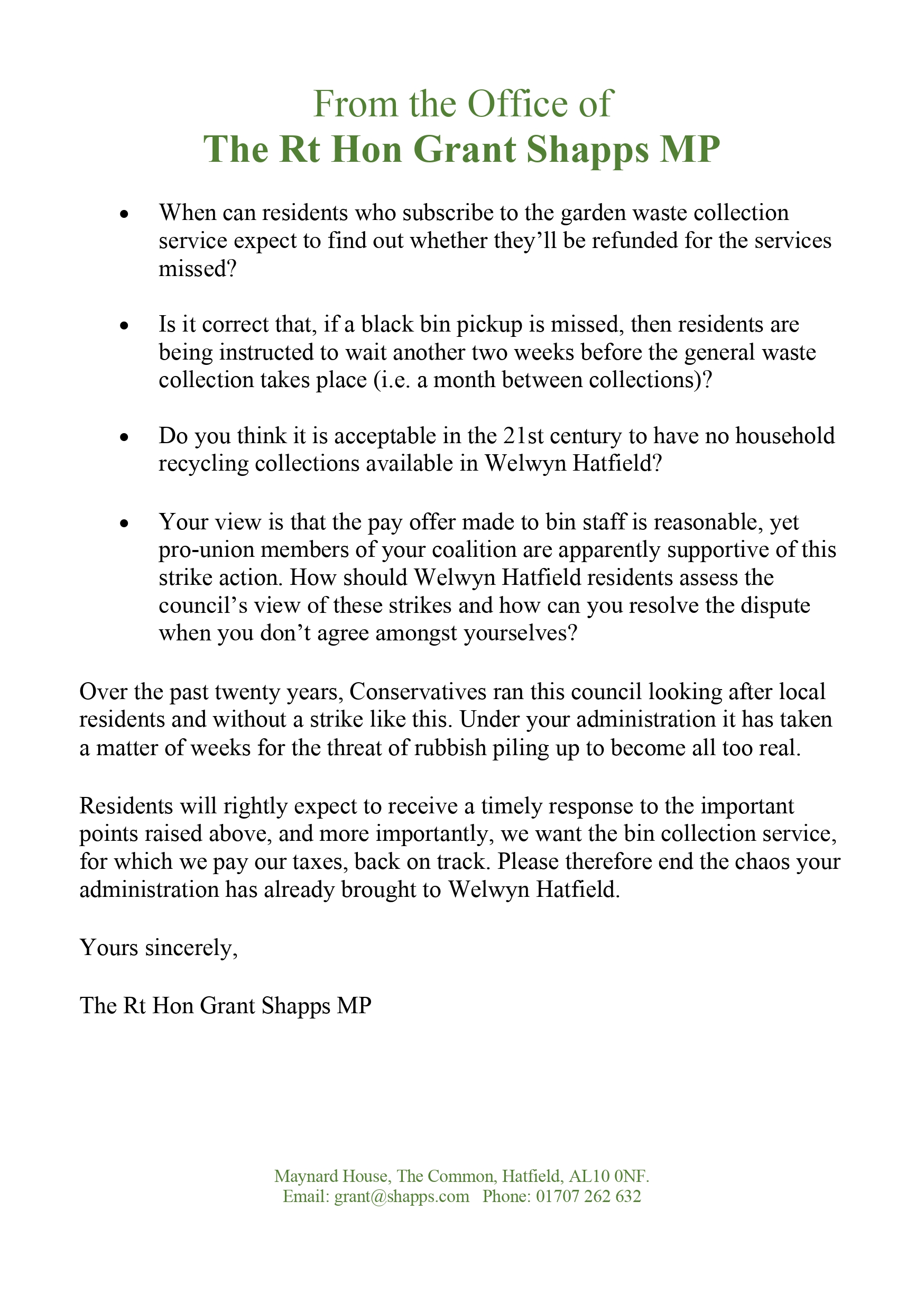 The local MP for Welwyn Hatfield, Grant Shapps, has written to the Lib Dem leader of Welwyn Hatfield Borough Council regarding the bin collection strike which began today.