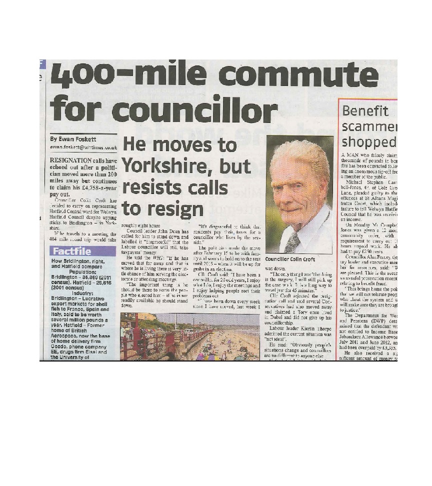 Local resident and MP Grant Shapps said, “The strength of feeling in the streets, shops, homes and pubs of Welwyn Hatfield is clear. The Welwyn Hatfield Times even carried out a survey which showed that 9 out of 10 residents reckon the commuting Labour Councillor Colin Croft should do the honourable thing and resign.